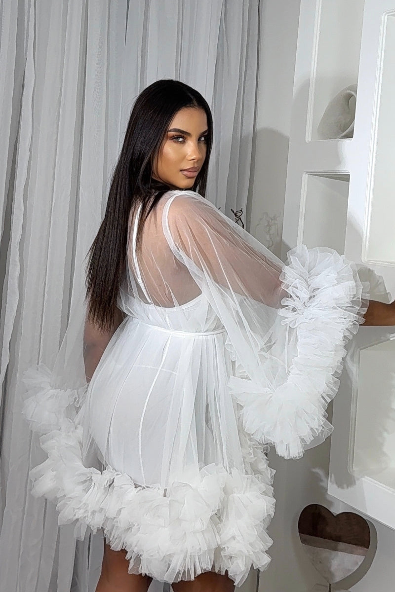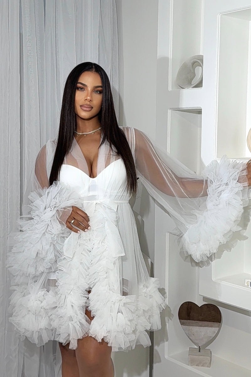 Unleash a touch of elegance with our Bridesmaid's Robe in WHITEThis luxurious bridesmaid features elegant flare sleeves and a feminine ruffled design, crafted from soft tulle net fabric. Perfect for getting ready on your special day, this exclusive piece adds a touch of sophistication to any bridal party.